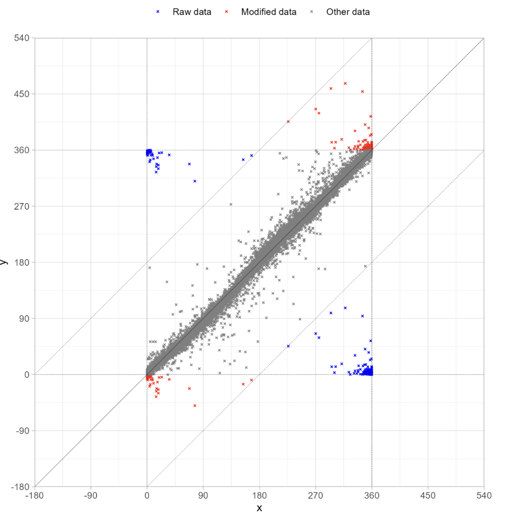 風向は、風が吹いてくる方向として、0°から360°までの範囲の値を取りますが、各データをそのまま精度検証に使用すると、参照データ𝑥(例:観測マストのデータ)と対象データ𝑦(例:ドップラーライダーのデータ)の2次元上の位置関係から、図1に示すような直線𝑦=𝑥から大きく乖離するデータ(Raw data)が含まれる可能性があるため、統計量が正しく算出されません。そこで精度評価を行う前に、2つのデータが直線𝑦=𝑥に沿うように、以下に示すような修正を行います。