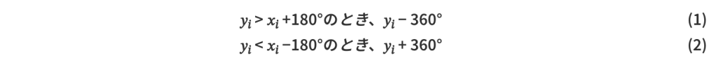 ここで、𝑥と𝑦の添字の𝑖(=1,2,3,…,𝑁)は個のデータを示します。図1に示すように、修正によってRaw dataの代わりにModified dataが得られ、風向の統計量を正しく算出できるようになります。