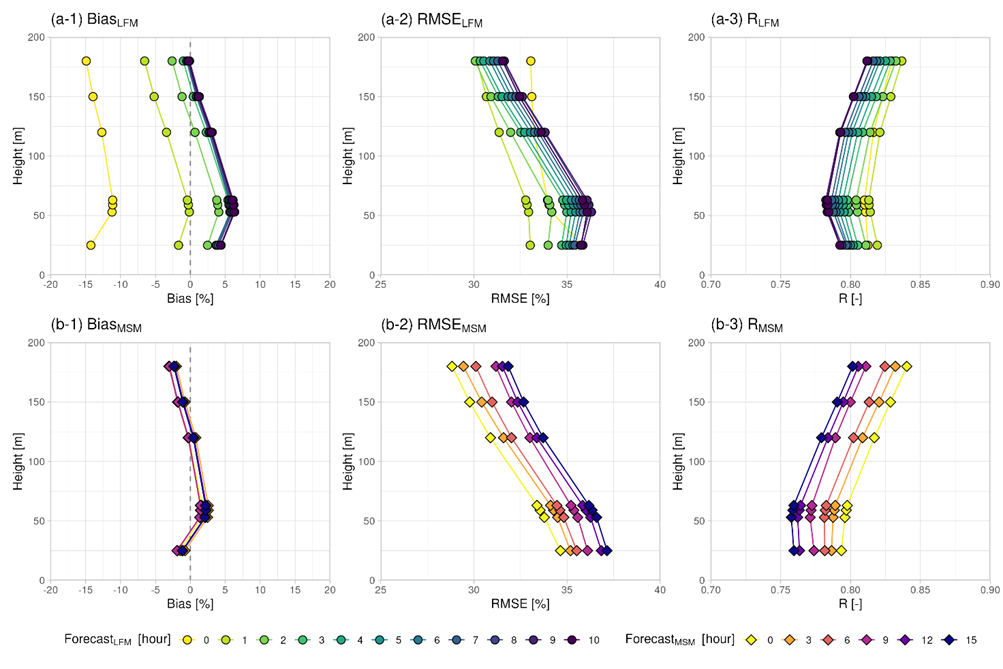 図2に、MTSの年間におけるLFM-GPV風速とMSM-GPV風速のBias、RMSE、Rの鉛直プロファイルを示します。検証の結果、LFM-GPVは初期値において風速を顕著に過小評価する傾向が確認されました。一方で、予報時間が進むにつれて、その誤差傾向は正方向へとシフトする特徴が見られました。これに対し、MSM-GPVでは初期値と予報値の間に大きな系統差は見られず、比較的に安定した風速の再現性を示しました。