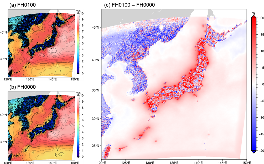 さらに、LFM-GPVの初期値と1時間予報値から算出した年平均風速分布を比較したところ(図3)、MTSで確認された初期値と予報値の大小関係が、日本周辺の広い領域においても生じていることが示唆されました。これは、LFMのデータ同化システムにおいて、AMeDAS(Automated Meteorological Data Acquisition System;地域気象観測システム)の風況観測データが同化されていることと関係している可能性があります。