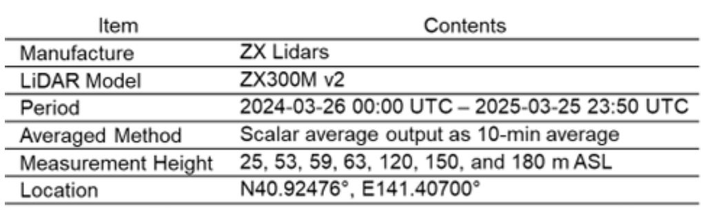 今回は、青森県六ヶ所村のむつ小川原洋上風況観測試験サイト(MTS)3)に設置された鉛直ライダー(ZX300M)による1年間の観測データを用いて、LFM-GPVおよびMSM-GPVの初期値および予報値における風速プロファイルの精度評価を行いました。図1にZX300Mの位置、表1に風況観測の概要を示します。GPV風速の評価指標には、Bias、RMSE、相関係数を用い、複数高度において定量的な比較を行っていました。