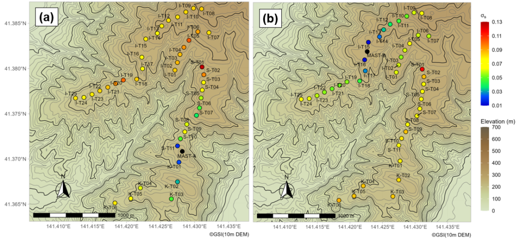 図2は、MAST-AとMAST-Bを基準にした各風車位置(高さ68m)での𝜎ₛ分布を示しています。両結果とも、観測地点に近い風車ほど𝜎ₛが小さく、距離が離れると大きくなる傾向が見られました。一方、S-T01では周辺より大きな値を示しました。国土数値情報の10mメッシュDEMによると、この地点は窪地で地形が複雑であり、𝜎ₛは距離だけでなく地形の微細な変化も反映していることが示唆されます。