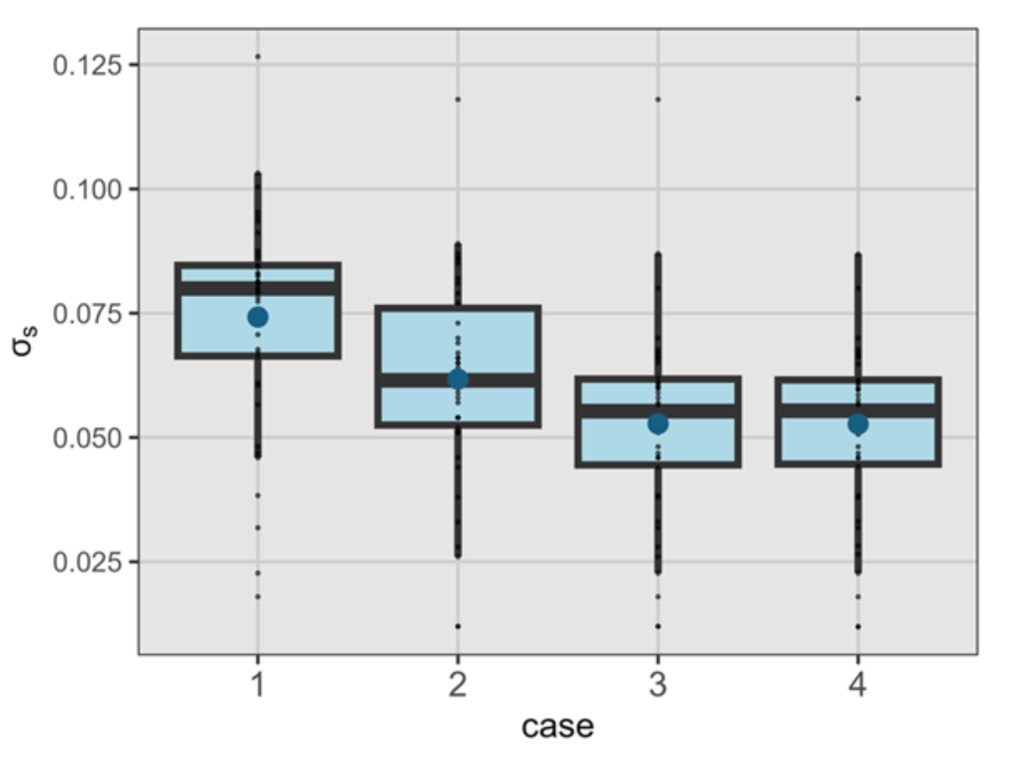 次に、表2と図3を用いて、複数の観測データが利用可能な場合に𝜎ₛを気流解析モデルの入力データ選択に応用する可能性を検討しました。ケース1・2では、風車群の中心に近いMAST-Bを用いたケース2の方が𝜎ₛの平均値・合計値が小さく、より高いサイト代表性を示しました。一方、ケース3・4では統計量に大きな差はなく、距離最小法と最類似法はほぼ同等の結果でした。この結果から、距離最小法および最類似法は、単独でデータを使用するより不確かさを低減できる可能性が示されました。